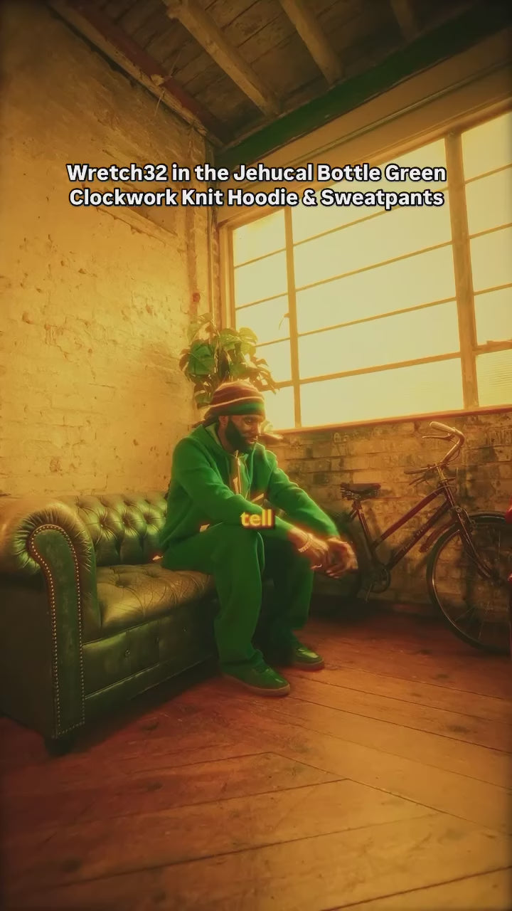 Introducing the Bottle Green Clockwork Knit Pants, the perfect blend of comfort and style, designed to pair seamlessly with the Bottle Green Clockwork Knit Hoodie. These pants feature the signature Jehucal Clockwork logo on the front, adding a distinctive, refined touch to their relaxed, baggy fit.