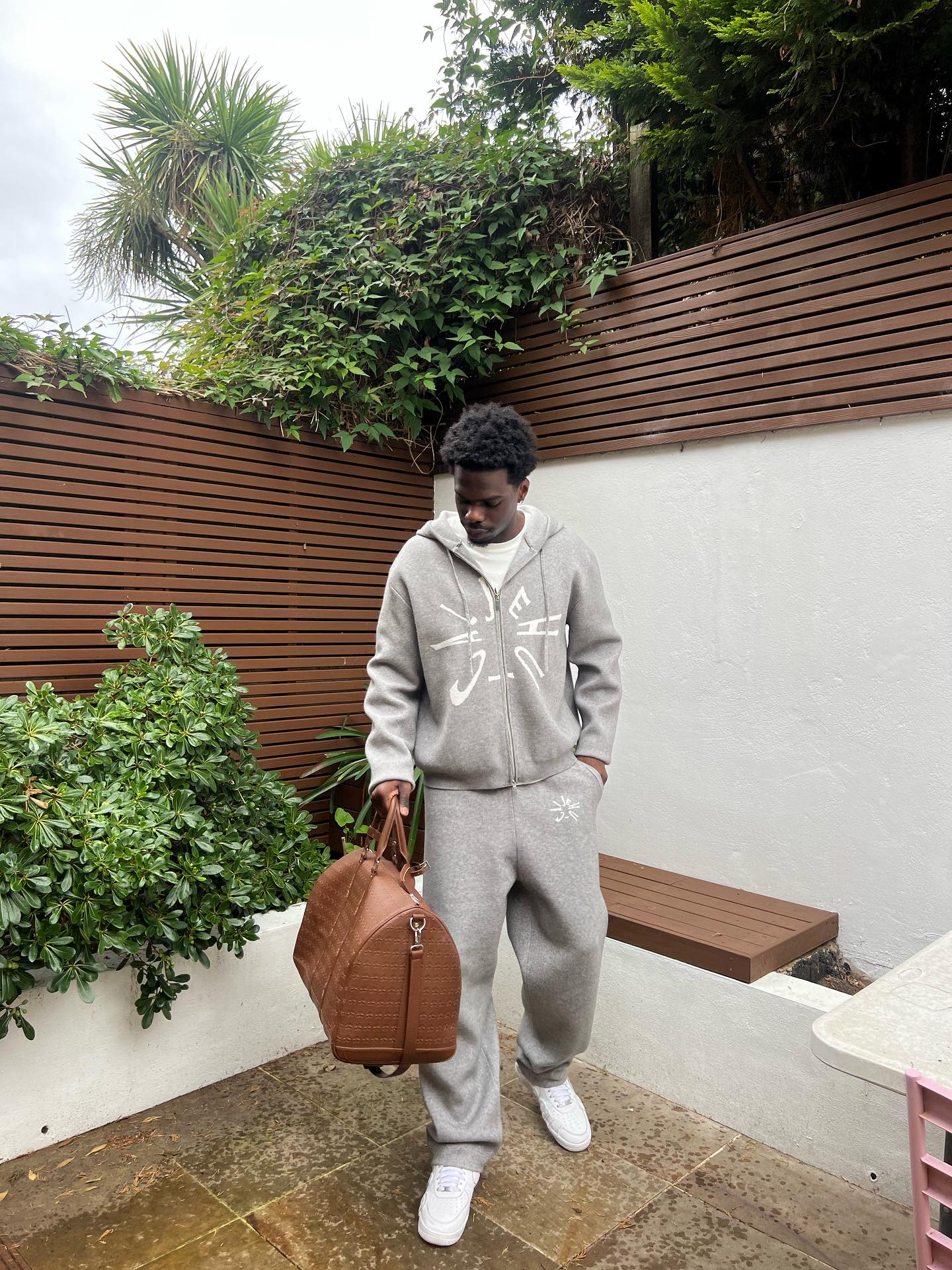Now for the other important part. Crafted from a premium jacquard knit, the Ash Pants bring softness, warmth, and structure in equal measure. Their versatile grey tone makes them adaptable across settings, while the bold Clockwork logo on the front grounds the piece in Jehucal’s world.